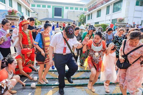 参加2024年海南黎族苗族传统“三月三”保亭主会场活动游客市民欢快地跳起竹竿舞。(文宏武 摄)