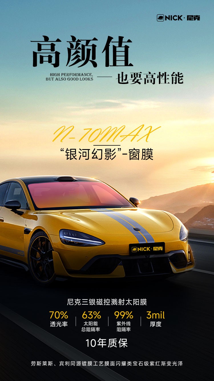 尼克三银前档玻璃太阳膜银河幻影N-70MAX,采用与劳斯莱斯、宾利同源的镀膜工艺,尽显千万级豪车同款奢华美学,为合作伙伴开拓高端市场提供有力武器。