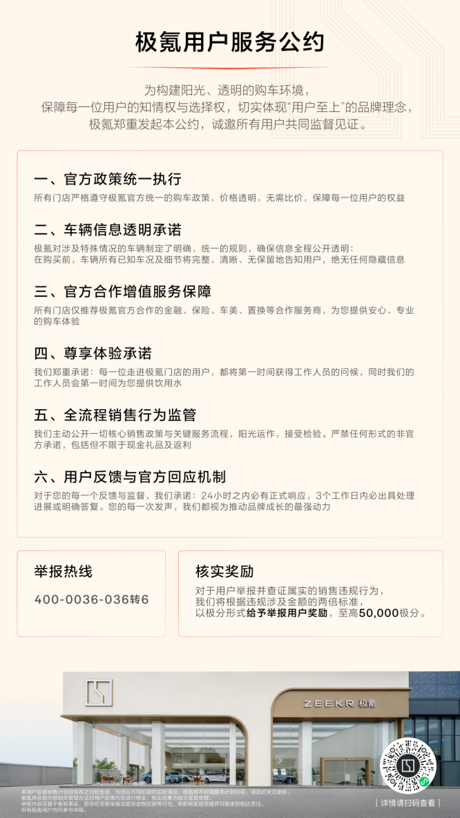 尤其是今年下半年以来,极氪采取了一系列积极的举措,包括在全国门店公示《极氪用户服务公约》、启动“神秘体验官”计划、为老车主开放“终身权益转移”等等,与用户沟通也更加主动坦诚,今年8月8日提前2个月公布多款在售车型年度更新计划,不仅赢得了用户的广泛好评,而且当月订单量不降反增,实现了销量与口碑的双赢。