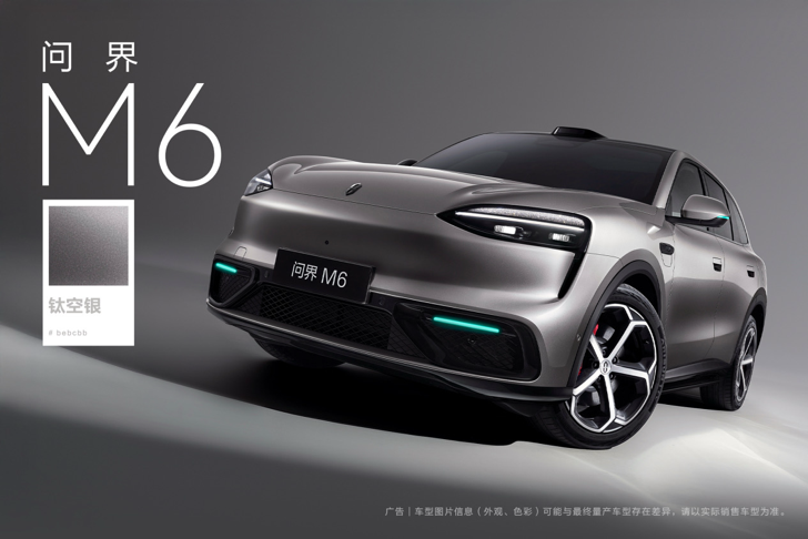 问界M6由华为设计力量全流程主导,遵循“极致、简约、纯净”美学原则,传承家族展翼设计并创新演绎,车身尺寸4960×1985×1736mm,轴距2950mm,兼顾SUV体量与轿跑动感。前脸俯冲姿态鲜明,晶曜大灯与尾灯单侧各含千颗晶钻折射体,AITO字样融入尾灯,辅助驾驶激活时前保险杠、后视镜、尾灯小蓝灯同步亮起。车身侧面光影丰富,提供星夜紫等七款外饰配色,采用五涂层油漆工艺,可选装黑曜运动套件,搭配20/21英寸共五种轮毂。 内饰为环抱式沉浸座舱,类机车造型中控呈对称布局,搭配D型方向盘与一体式运动座椅,提供紫慕白等四款内饰配色,17处可调节氛围灯搭配2.352m²全景天幕+直驱式电动遮阳帘;主副驾配备318×100mm超大化妆镜,支持三档色温与亮度调节。
