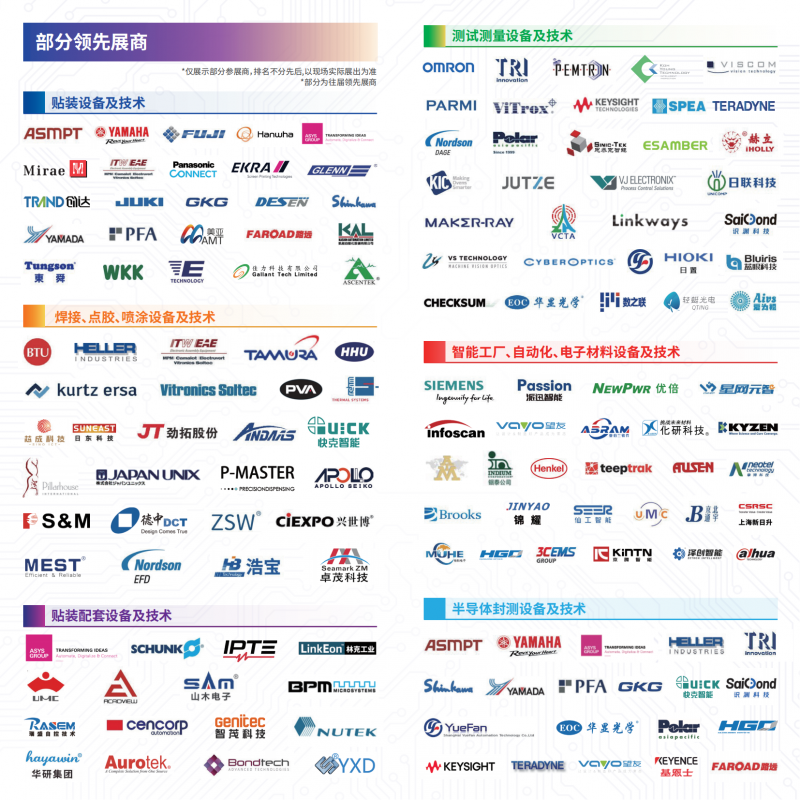 NEPCON China 2024展览会展会不仅将展示SMT国际头部企业的全品牌阵容、广泛展品范围及新制造技术,还涵盖了表面贴装及印刷、半导体封测、测试测量及配套设备、焊接及点胶喷涂、防静电、电子元器件及配件、智能工厂等多个领域。如ASMPT、FUJI、YAMAHA、Hanwha、JUKI、凯格、Koh Young,Omron、Viscom、Keysight、思泰克、Heller、Rehm、日东、快克等都将出现在这场电子行业盛会的舞台上。呈现电子制造工厂各环节的解决方案,展现电子制造全产业链新质力量。