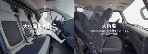 每一位物流司机都是努力上进的奋斗者,有必要为他们营造一个舒适安心的驾乘环境,让他们每一次出行都顺心愉悦。E福顺和E顺达通过打造专属的纯电商用车驾驶室,以巧妙的座椅和手刹等系统设计,让1.88米的大高个坐在主驾位,头上依然还有两拳空间,膝盖还有一拳空间。配合人体工学座椅,良好的支撑性和包裹性,即便长时间驾驶也能保持舒适。不仅空间大,E福顺可选配行业少有的前排超宽三人座,出行可多带一个人,在等单或充电时躺着休息更舒服;E顺达副驾靠背调节角度可达36°,媲美高铁一等座。车内噪音控制得当,低至45dB,静谧性极佳。